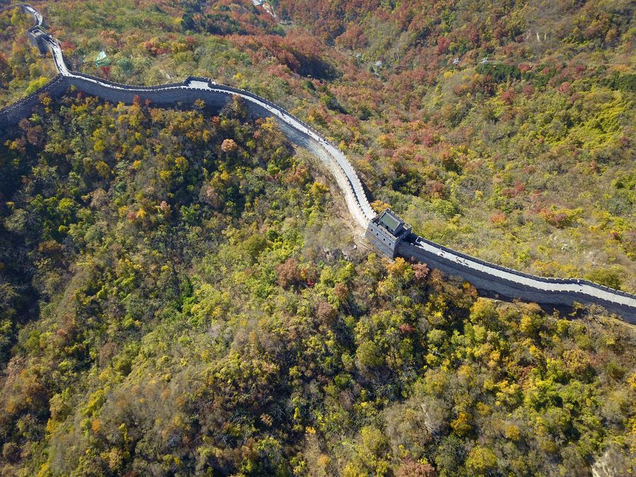 Aerial photo shows autumn scenery at the Mutianyu Great Wall in Beijing, Nov. 4, 2019. (Xinhua/Chen Zhonghao)
