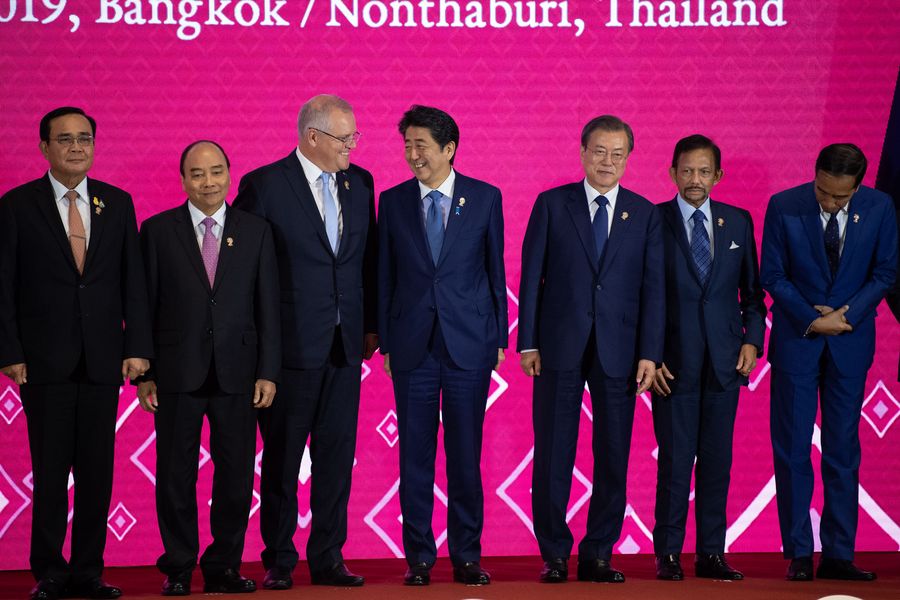 (From L to R) Thai Prime Minister Prayut Chan-o-cha, Vietnamese Prime Minister Nguyen Xuan Phuc, Australian Prime Minister Scott Morrison, Japanese Prime Minister Shinzo Abe, South Korean President Moon Jae-in, Brunei Sultan Haji Hassanal Bolkiah and Indonesian President Joko Widodo react during a photo session of the 3rd Regional Comprehensive Economic Partnership (RCEP) Summit in Bangkok, Thailand, Nov. 4, 2019. (Xinhua/Zhu Wei)