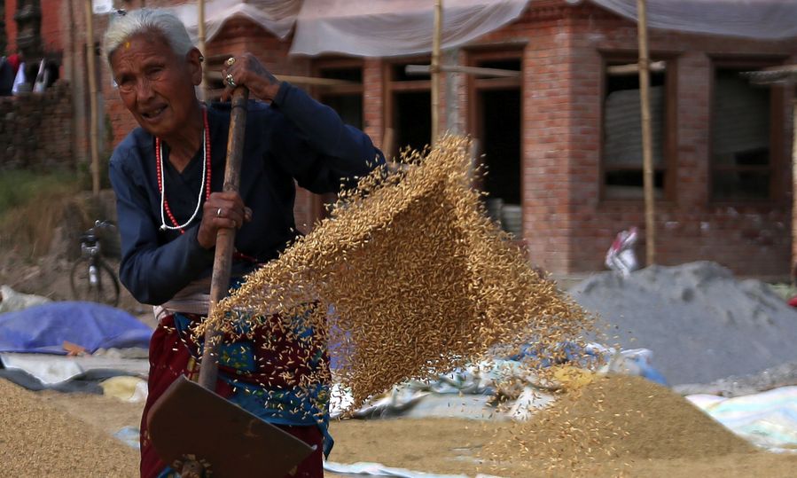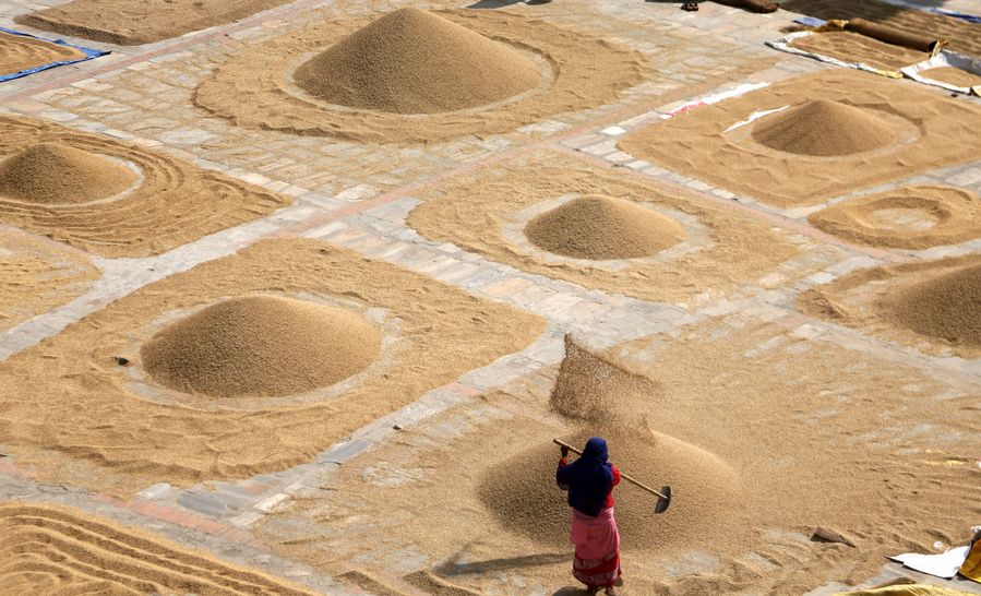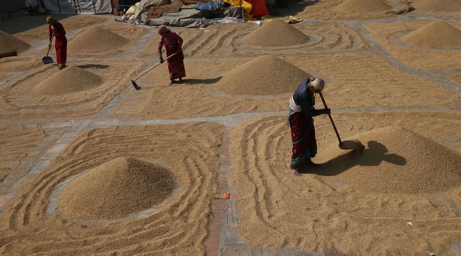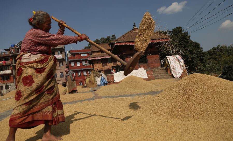 Farmers dry harvested rice for winnowing in Bhaktapur, Nepal, Nov. 4, 2019. (Photo by Sunil Sharma/Xinhua) ■