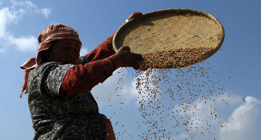 A woman winnows rice after harvesting in Bhaktapur, Nepal, Nov. 4, 2019. (Photo by Sunil Sharma/Xinhua)