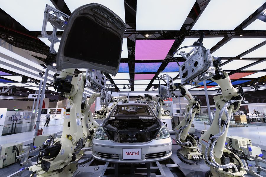The high-speed spot welding SRA series robots of Nachi company from Japan at the Equipment exhibition area during the second China International Import Expo (CIIE) in Shanghai, east China. (Xinhua/Fan Peishen)