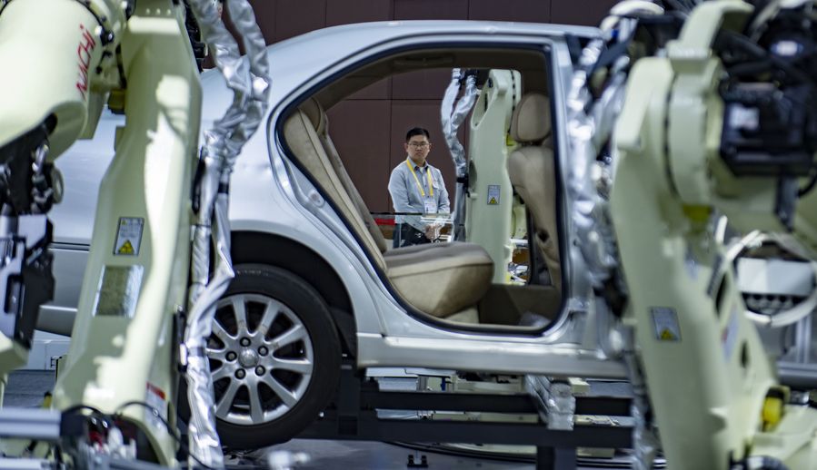 The high-speed spot welding SRA series robots of Nachi company from Japan at the Equipment exhibition area during the second China International Import Expo (CIIE) in Shanghai, east China. (Xinhua/Wang Peng)
