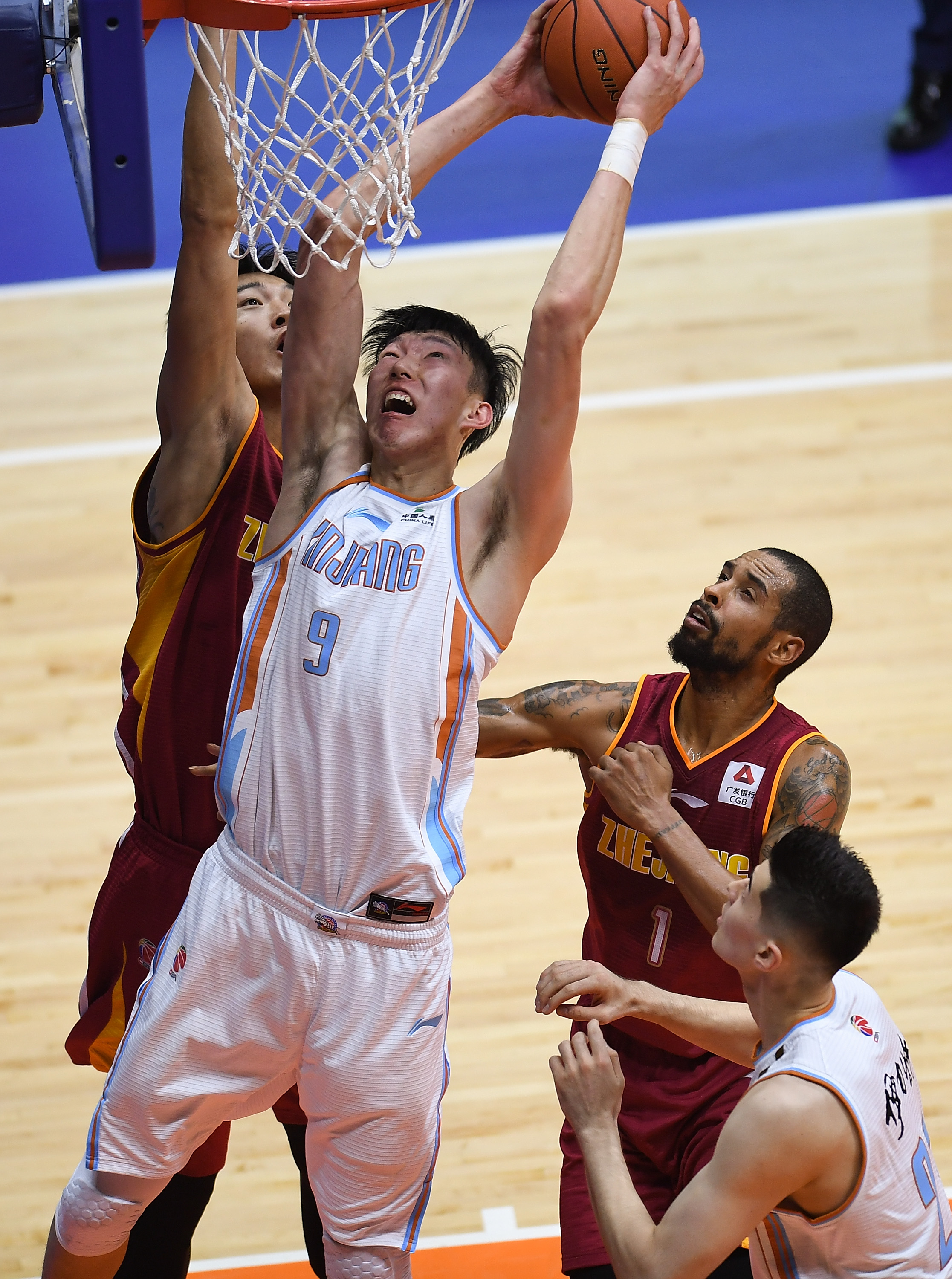 Xinjiang's center Zhou Qi is dunking in the game against Zhejiang. (Xinhua/Song Yanhua)