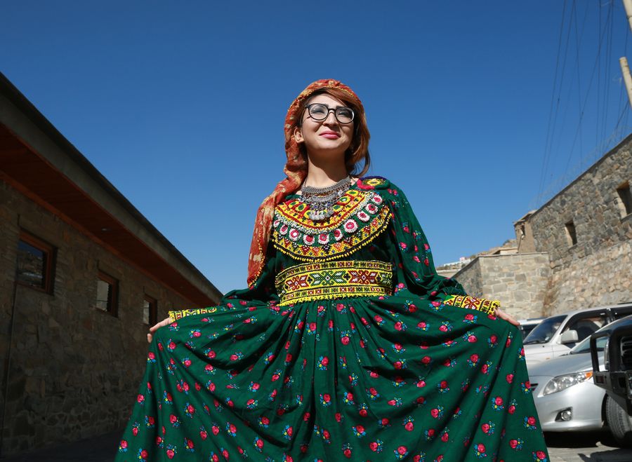A model poses for photos after presenting costumes of ethnic people in Afghanistan during a fashion show in Kabul, capital of Afghanistan, Nov. 4, 2019. (Photo by Rahmatullah Alizadah/Xinhua)