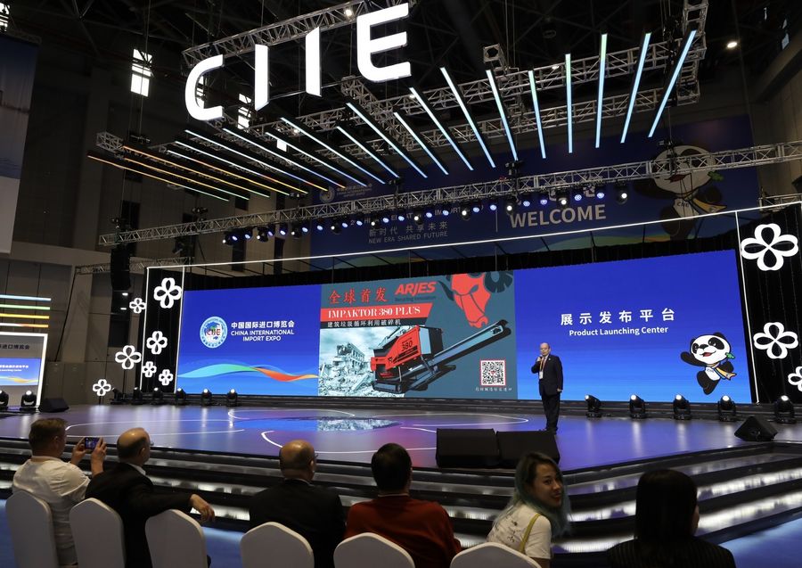 The construction waste recycling crusher IMPAKTOR 380 PLUS developed by German ARJES is unveiled at the product launching center of the second China International Import Expo (CIIE) in Shanghai, east China, Nov. 6, 2019. Many new technologies and products made debut during the second CIIE held in Shanghai. (Xinhua/Jin Liwang)