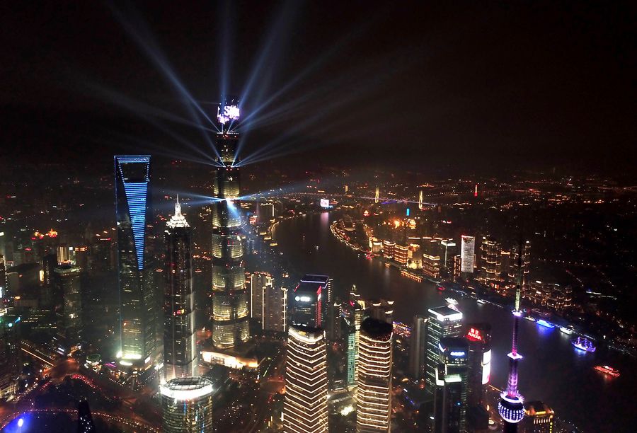 Aerial photo taken on Oct. 17, 2018 shows night view of Lujiazui area in Shanghai, east China. The first China International Import Expo (CIIE) is scheduled to be held from Nov. 5 to 10 in Shanghai. (Xinhua/Ren Long) (wyl)