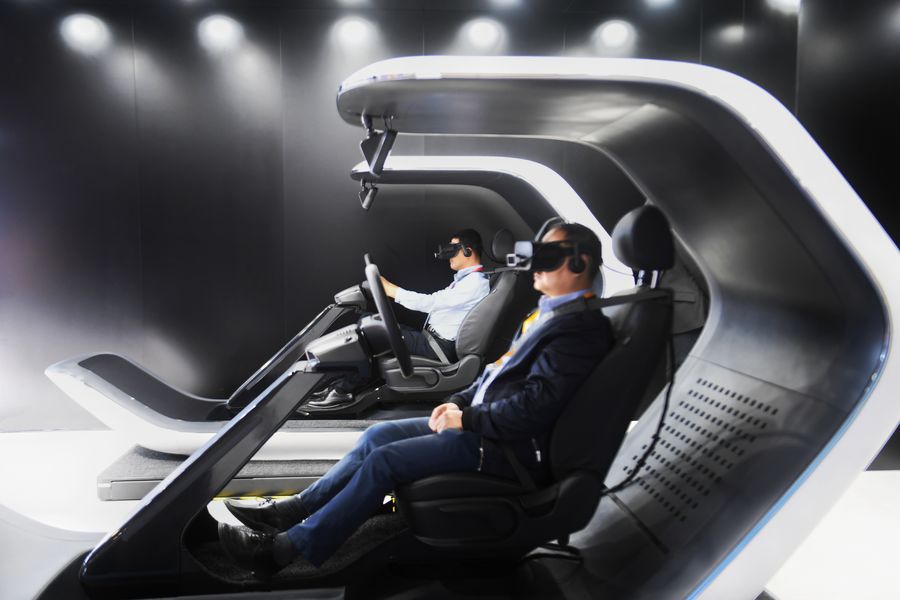Visitors experience driving simulators at the booth of Kia Motors at the Automobile exhibition area during the second China International Import Expo (CIIE) in Shanghai, east China, Nov. 5, 2019. The second CIIE kicked off Tuesday at the National Exhibition and Convention Center in Shanghai. (Xinhua/Purbu Zhaxi)