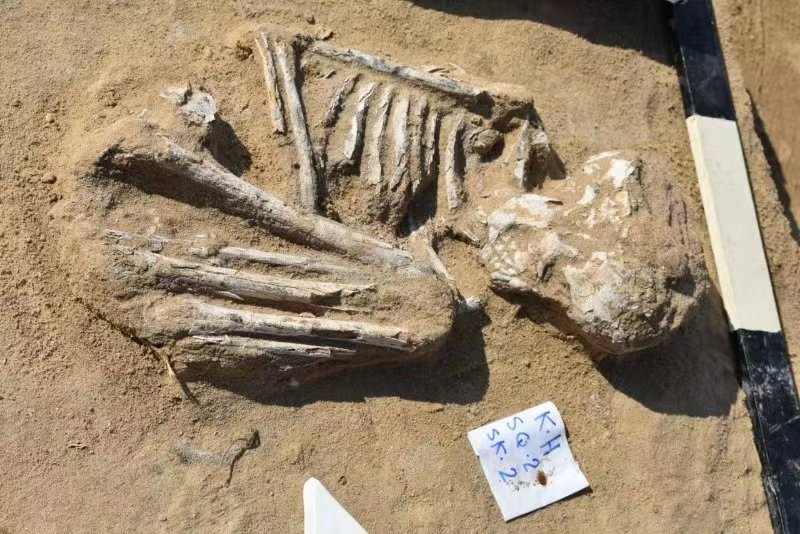 A skeleton in the squatting position was discovered in a catacomb in Ismailia province, Egypt. (Xinhua/Egyptian Ministry of Antiquities)