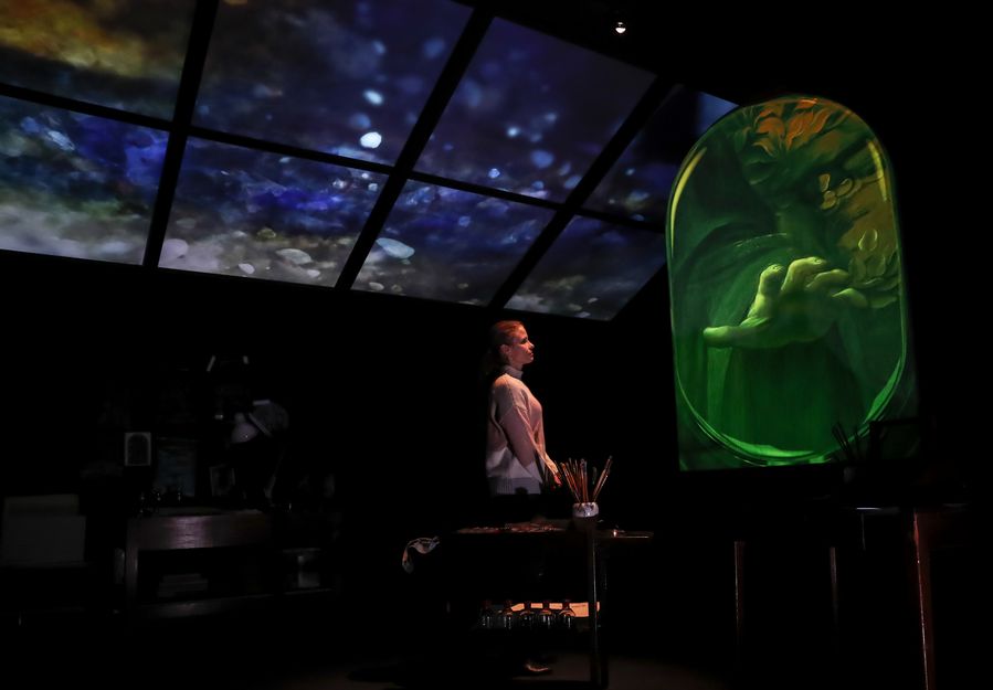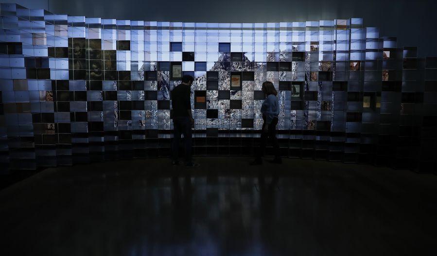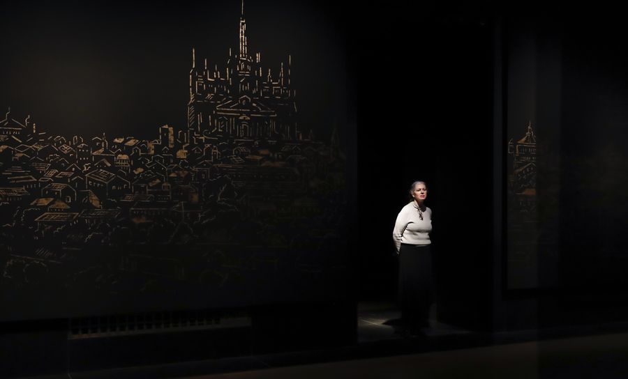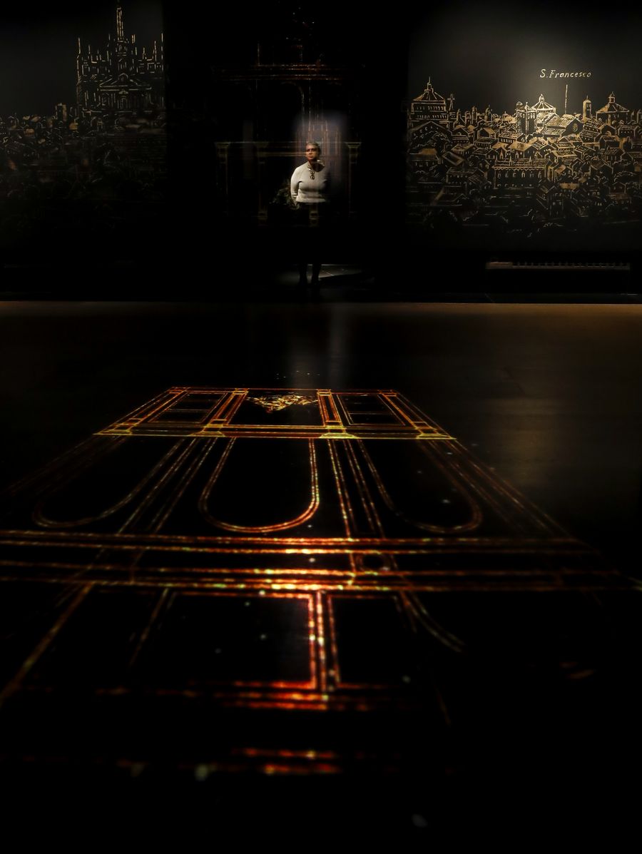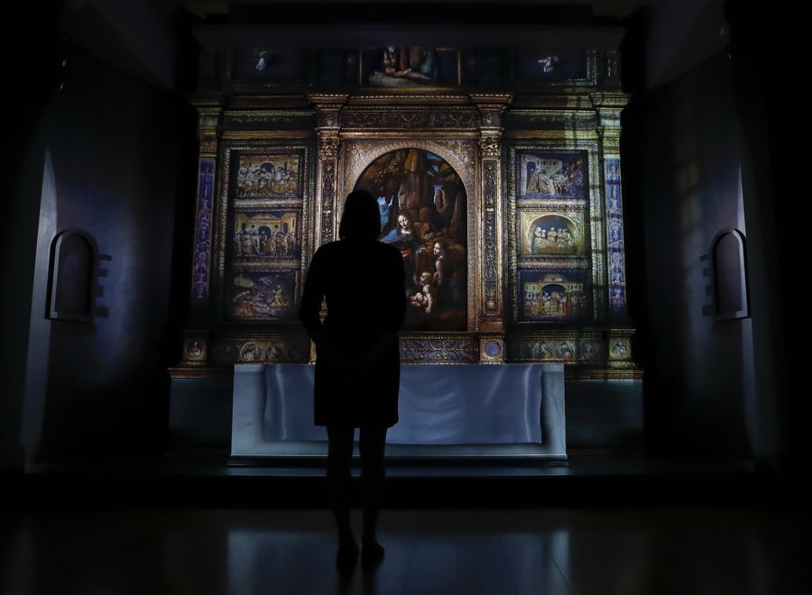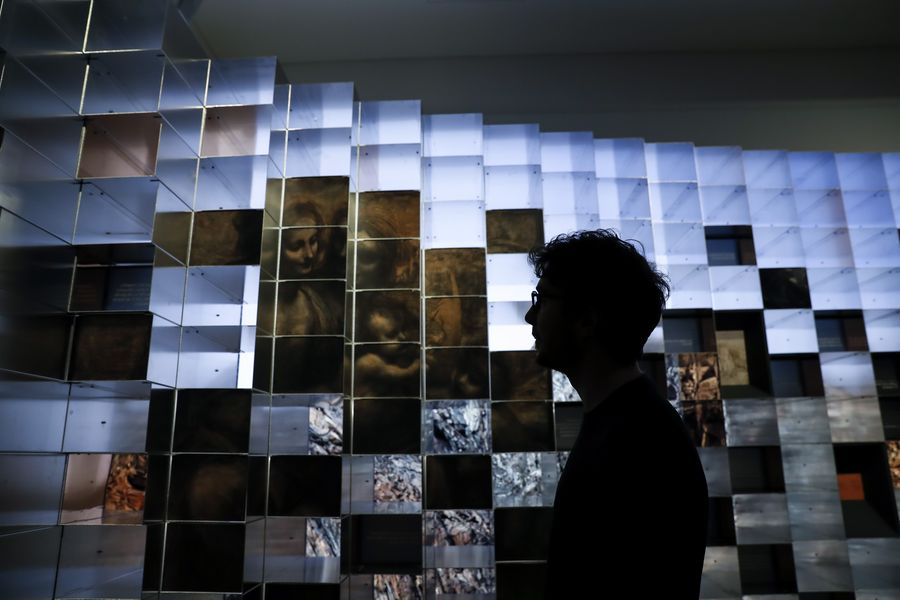 A visitor admires exhibits at a press preview of an exhibition in commemoration of Leonardo da Vinci at the National Gallery in London, Britain, Nov. 5, 2019.(Xinhua/Han Yan)