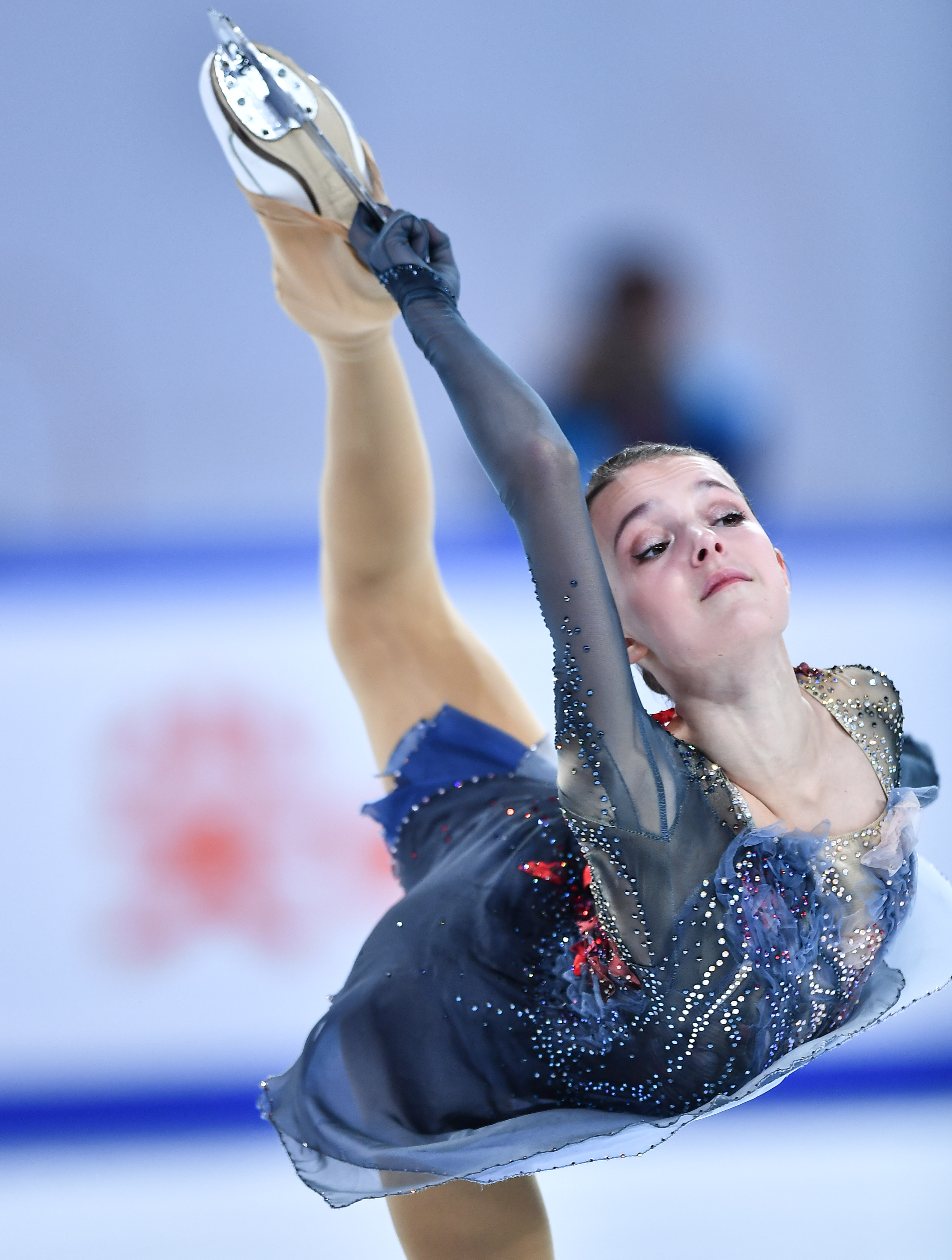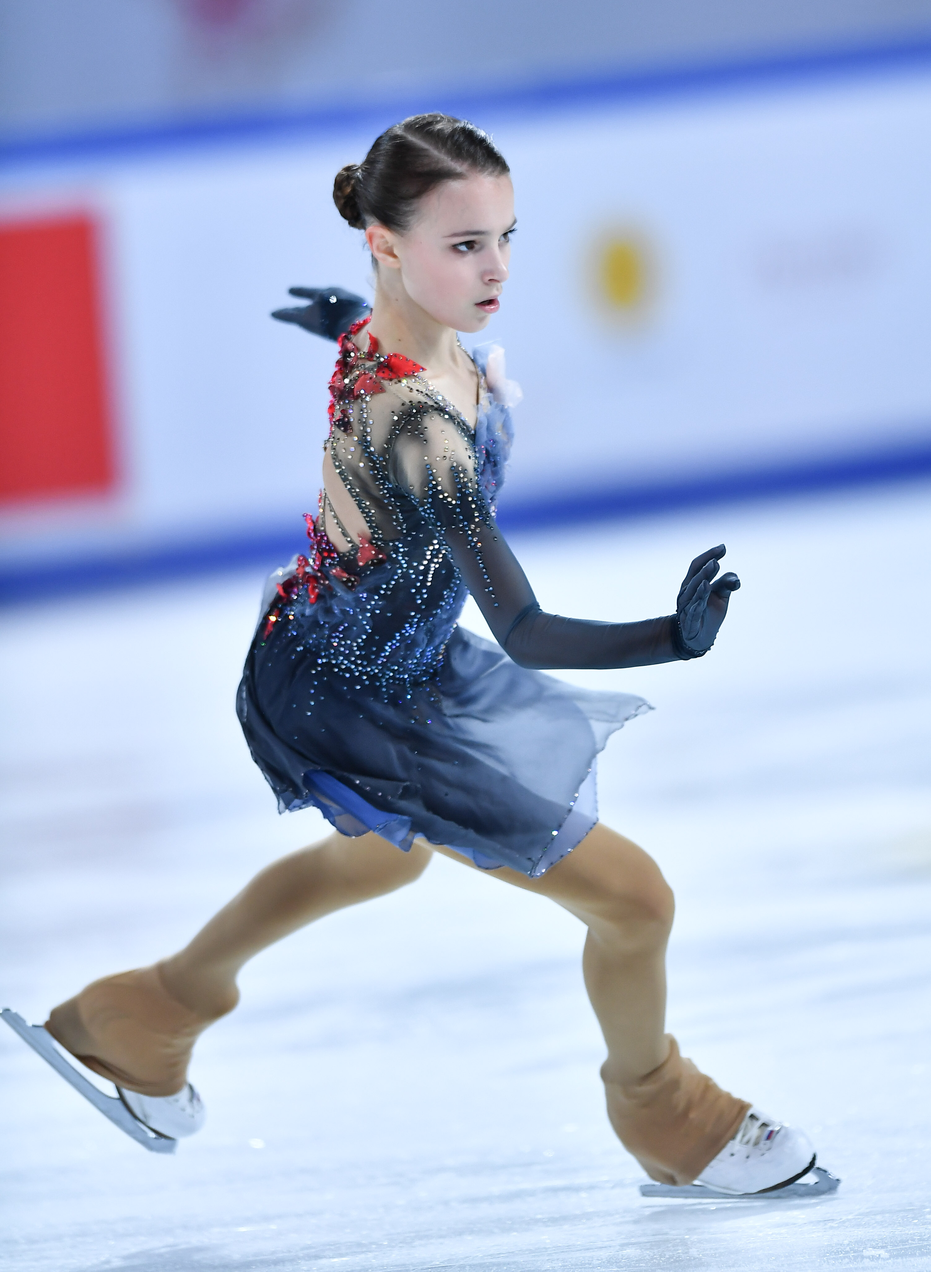 Skating to soundtrack The Perfume, the 15-year-old Russian champion opened her routine with a double Axel and a triple flip before a triple Lutz-triple Loop combination, while she completed all her three spins on level four.
