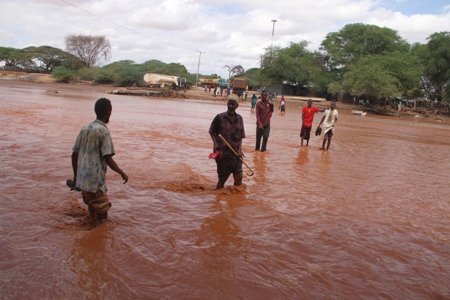 Residents struggle to cross the Modogashe seasonal river after it busted its banks due to heavy rains in Wajir, northern Kenya, Apr. 27, 2019. (Xinhua/Allan Mutiso)