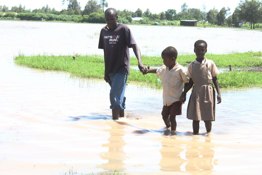 Pupils of Ombaka Primary School wade through a flooded road in Nyando, Kisumu county, Kenya, May 3, 2018. (Xinhua/Allan Mutiso)