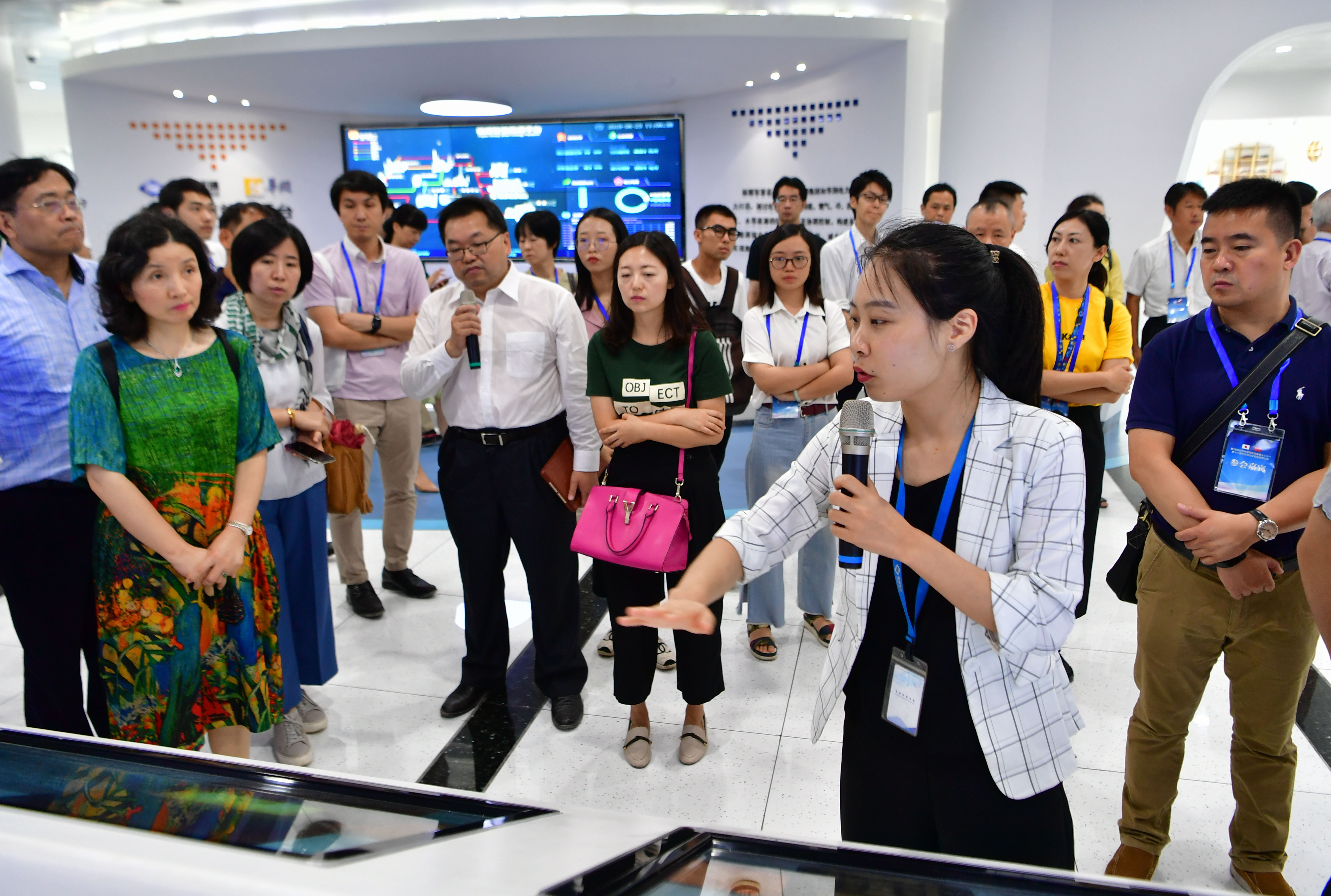 A staff introduces Fuyao Group's glass technologies to visitors from Japan in Fuqing, southeast China's Fujian Province, Aug. 23, 2019. (Xinhua/Wei Peiquan)