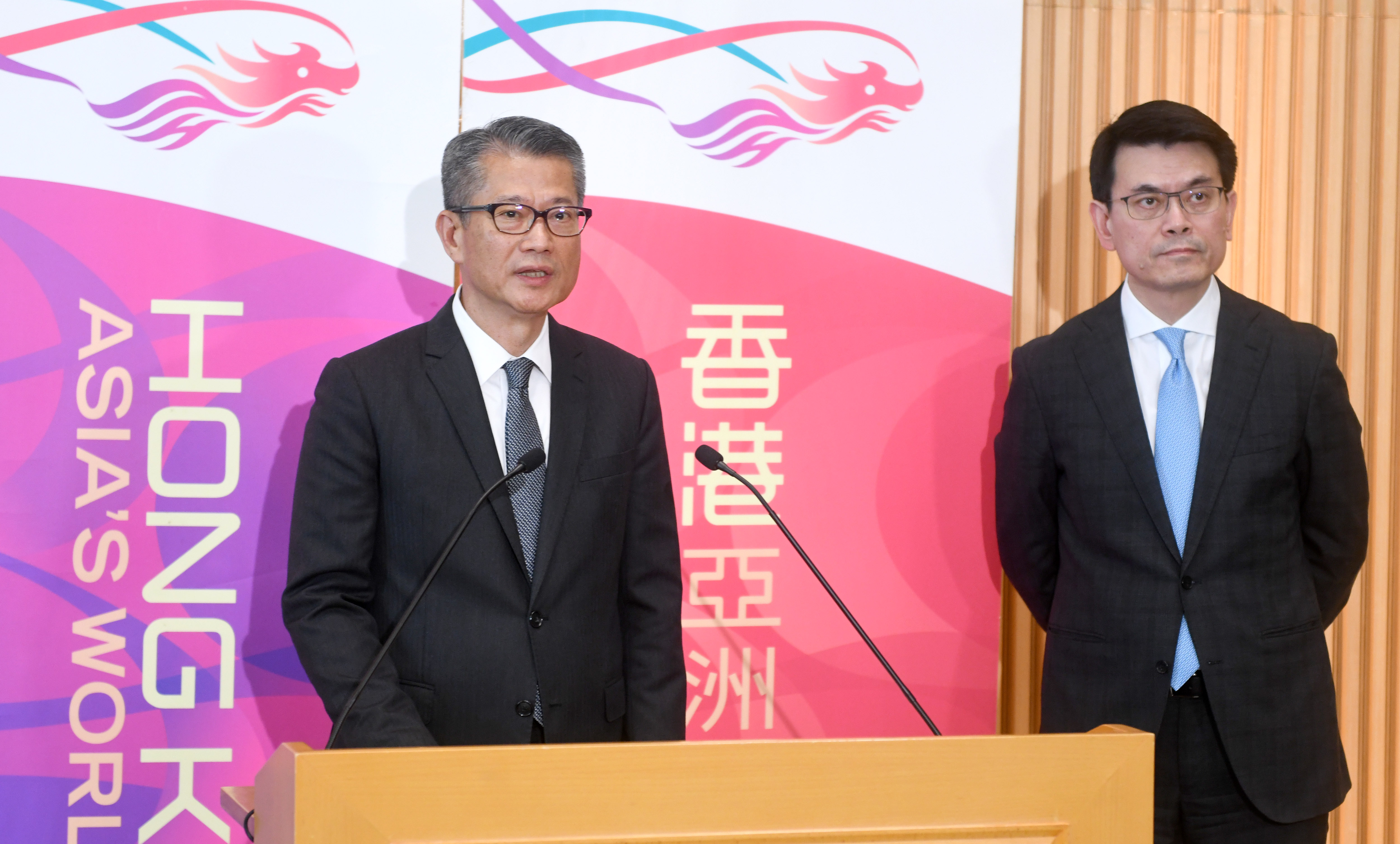 Paul Chan (L), financial secretary of the Hong Kong Special Administrative Region (HKSAR) government, attends a press conference in China's Hong Kong, Sept. 4, 2019. (Xinhua/Lu Hanxin)