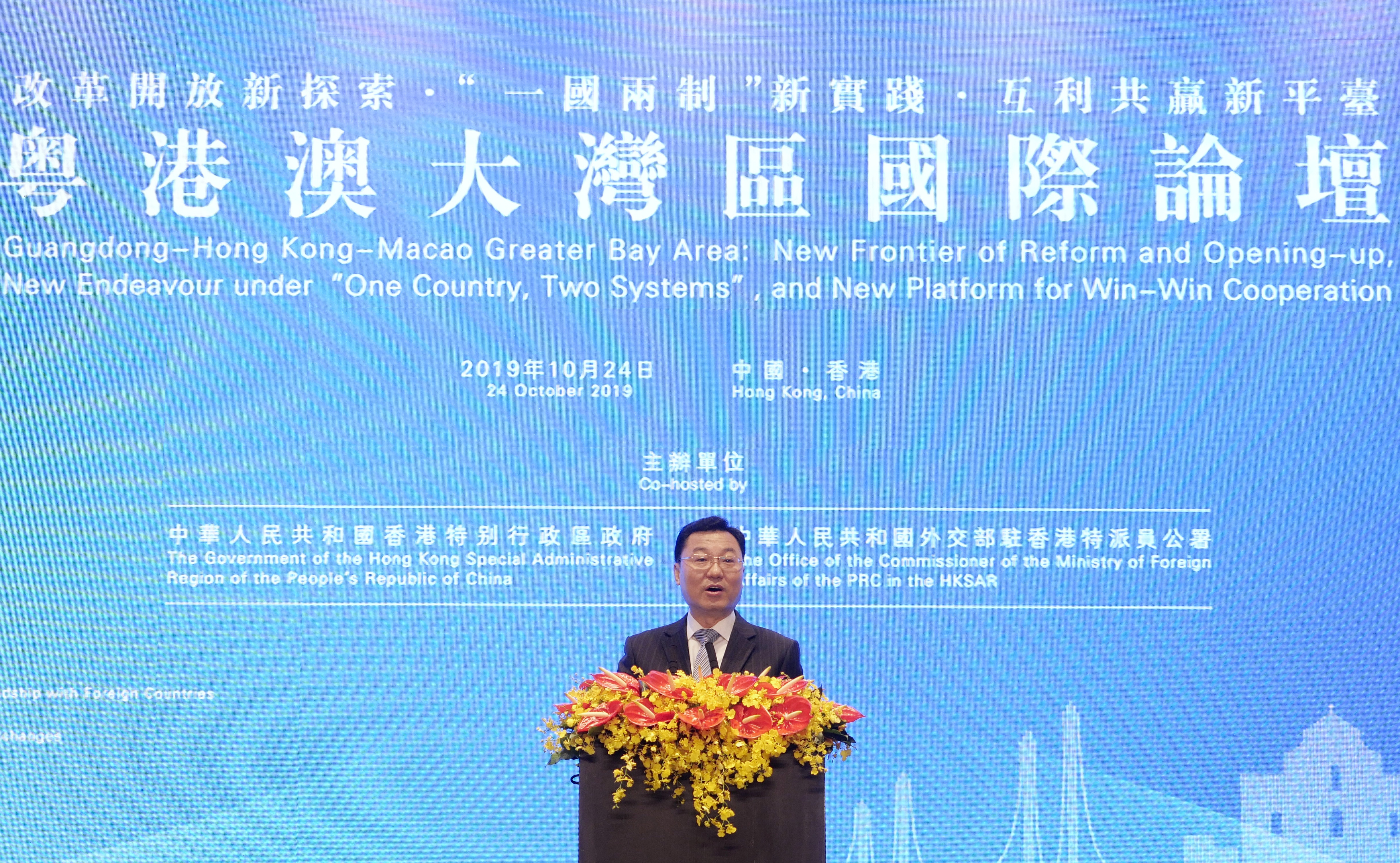 Xie Feng, commissioner of the Ministry of Foreign Affairs of China in the Hong Kong Special Administrative Region (HKSAR), delivers a speech at a forum on the development of the Greater Bay Area in Hong Kong, south China, Oct. 24, 2019. (Xinhua/Wang Shen)