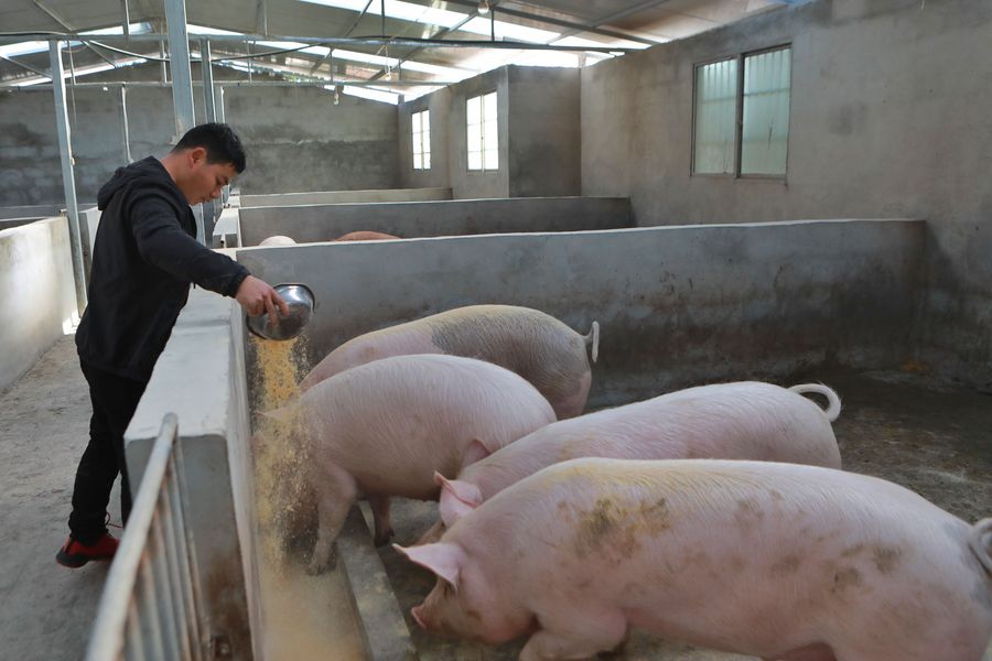 A villager feeds pigs in Nayong County of Bijie City, southwest China's Guizhou Province, February 6, 2019. (Xinhua/Ou Dongqu)