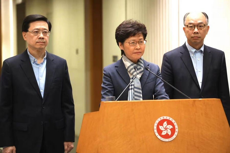 Chief Executive of the Hong Kong Special Administrative Region (HKSAR) Carrie Lam said in the evening that the HKSAR government will not yield to pressure from escalating violence that is destroying Hong Kong.