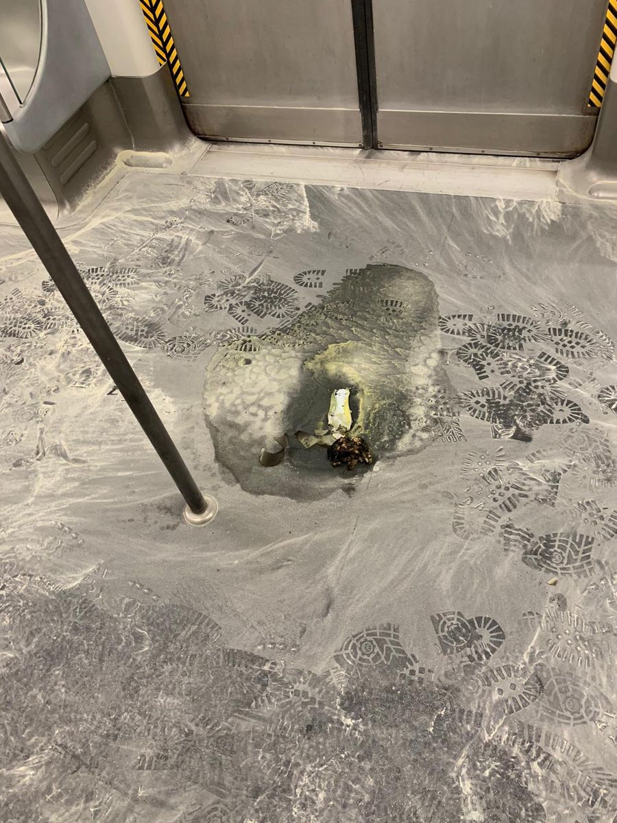 Photo taken on Nov. 11, 2019 shows a petrol bomb threw into an MTR train carriage. (Xinhua)