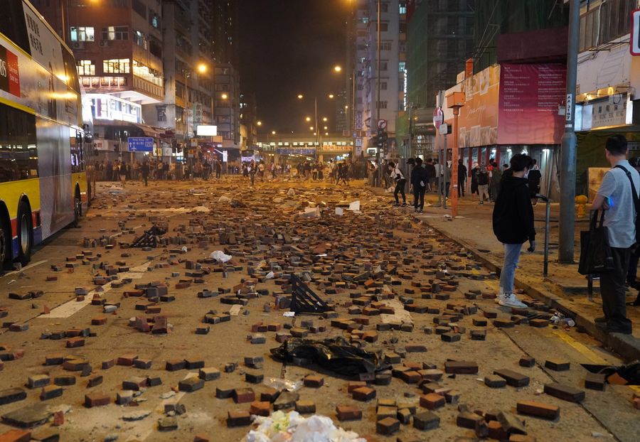 Rioters paralyze traffic with bricks and garbages in Causeway Bay, south China's Hong Kong on Nov. 11, 2019. (Xinhua)