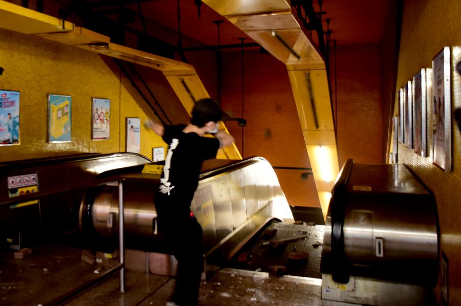 Photo taken on Nov. 11, 2019 shows a rioter destroying the escalator inside a metro station in Hong Kong. (Xinhua)