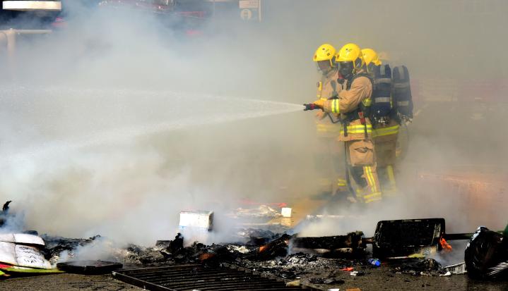 Firefighters are putting out fires set by rioters in Sai Wan Ho area in Hong Kong, south China, on Nov. 11, 2019. (Xinhua)