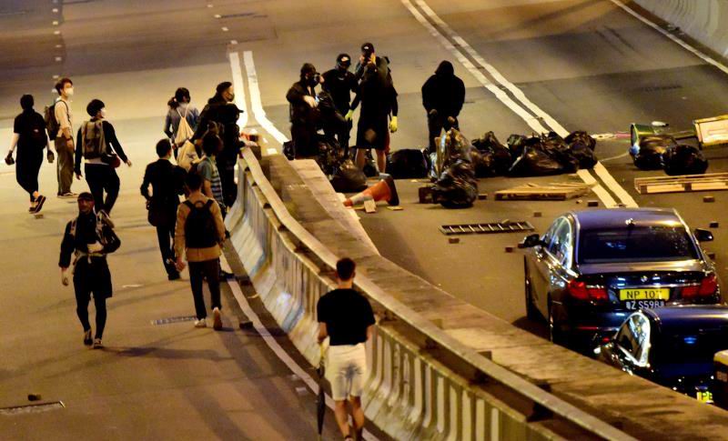 Rioters block road in Central district in south China's Hong Kong, on Nov. 12, 2019. (Xinhua)
