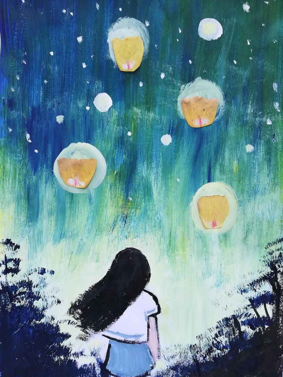 A girl watches sky lanterns. (Photo provided to Xinhua)