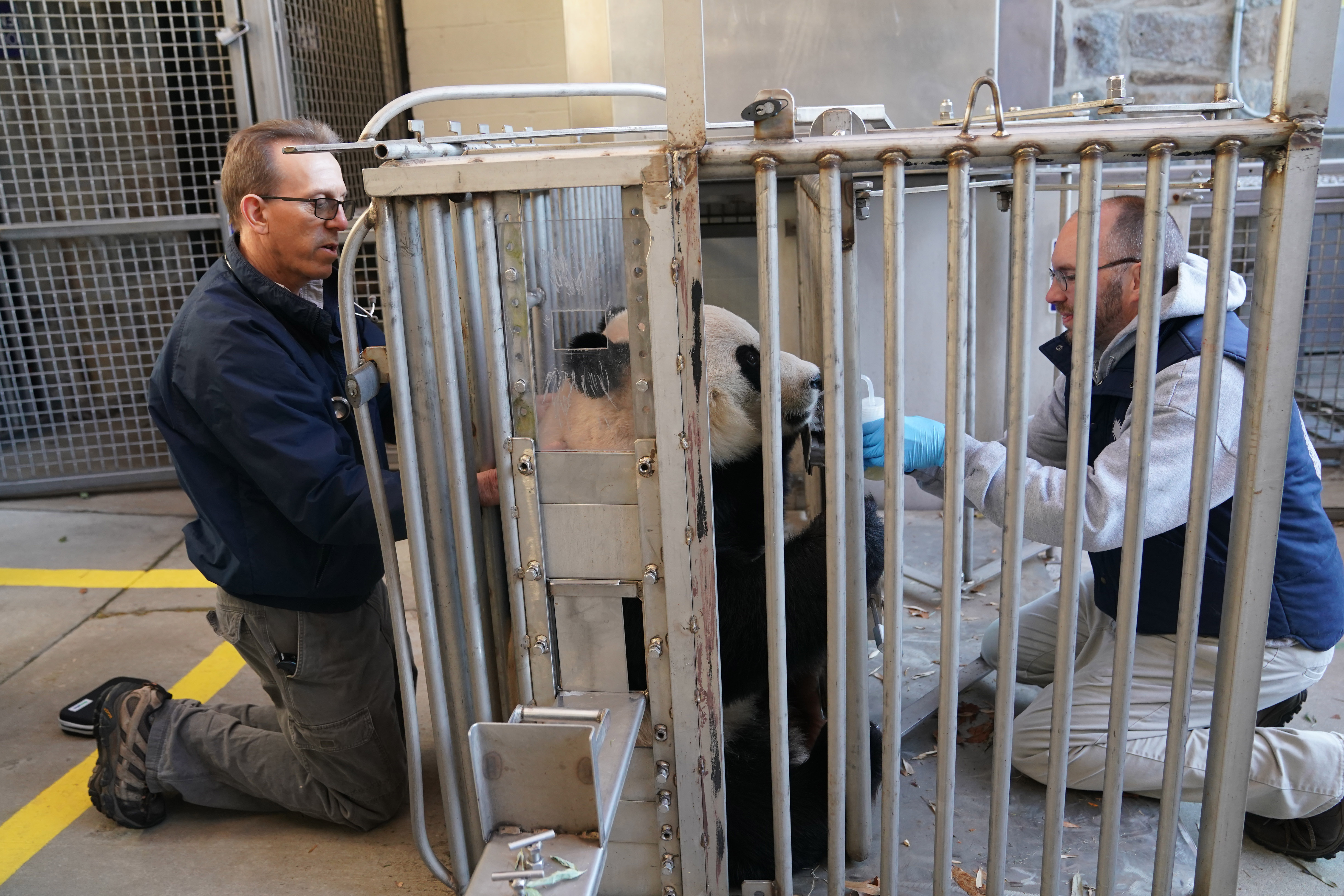 Chief veterinarian of the Smithsonian's National Zoo, Dr. Don Neiffer (L) and his colleague give giant panda Bei Bei a health check at the zoo in Washington D.C. on Nov. 13, 2019. (Xinhua/Liu Jie)