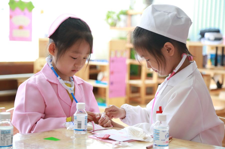 Children try simulated vaccination at a kindergarten in Xingtai City, north China's Hebei Province, April 25, 2019. (Xinhua/Zhang Chi)