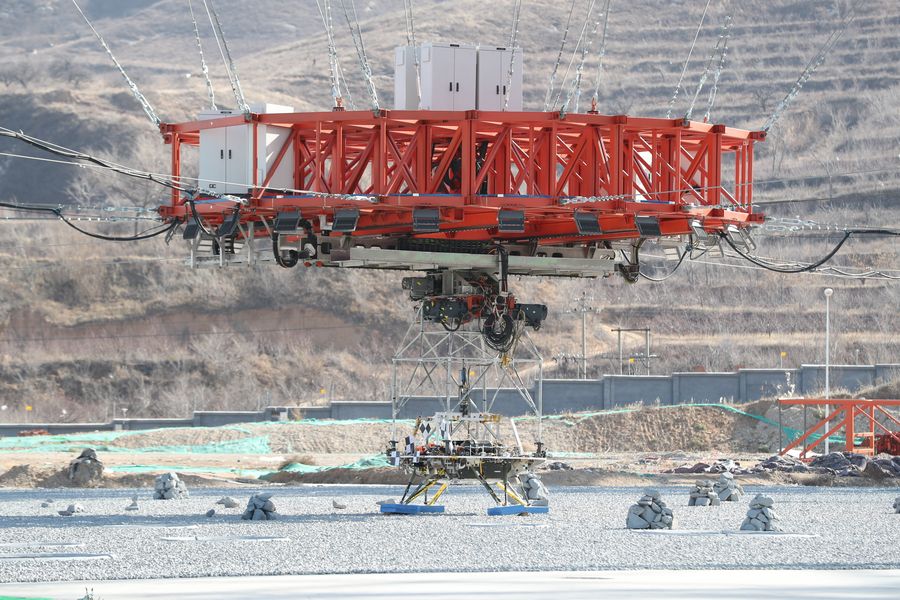 A red platform in the middle of the pylons is fixed by 36 steel cables. Through precise control, the platform is able to simulate the Martian gravitational environment for the lander, and is able to follow the lander to move precisely.