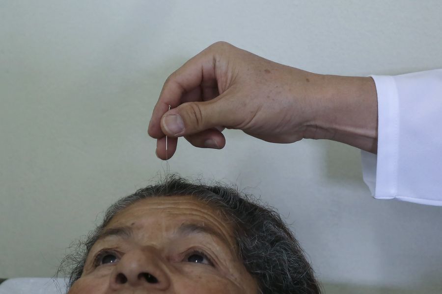 Photo taken on July 15, 2015 shows a patient receiving acupuncture treatment at a public health center in Sao Paulo, Brazil. (Xinhua/Rahel Patrasso)
