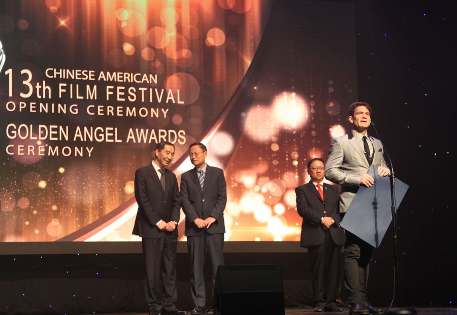 The file photo shows that Stu Levy (front), who chairs the International Committee of Producers Guild of America (PGA), addresses the opening ceremony of the 13th Chinese American Film Festival (CAFF), in Los Angeles, the United States, Nov. 1, 2017. (Xinhua/Gao Shan)