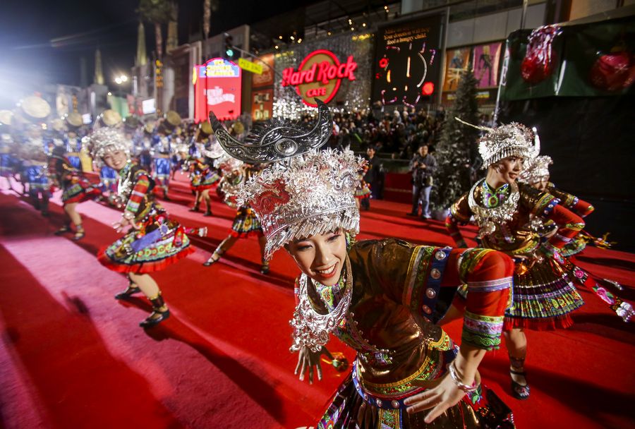 Dancers from China perform along Hollywood Boulevard during the 84th Annual Hollywood Christmas Parade in Los Angeles, the United States, Nov. 29, 2015. (Xinhua/Zhao Hanrong)