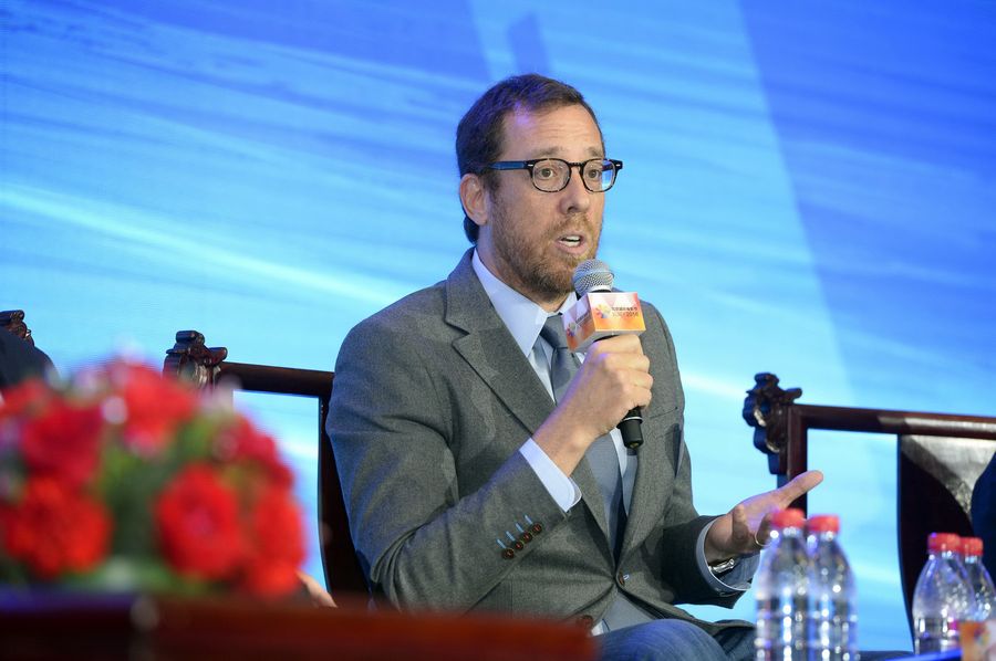 Rob Minkoff, director of film "The Lion King", speaks at the China-U.S. Film Investments & the Globalization of Chinese Films Forum in Beijing, capital of China, April 19, 2016. (Xinhua/Zhou Mi)