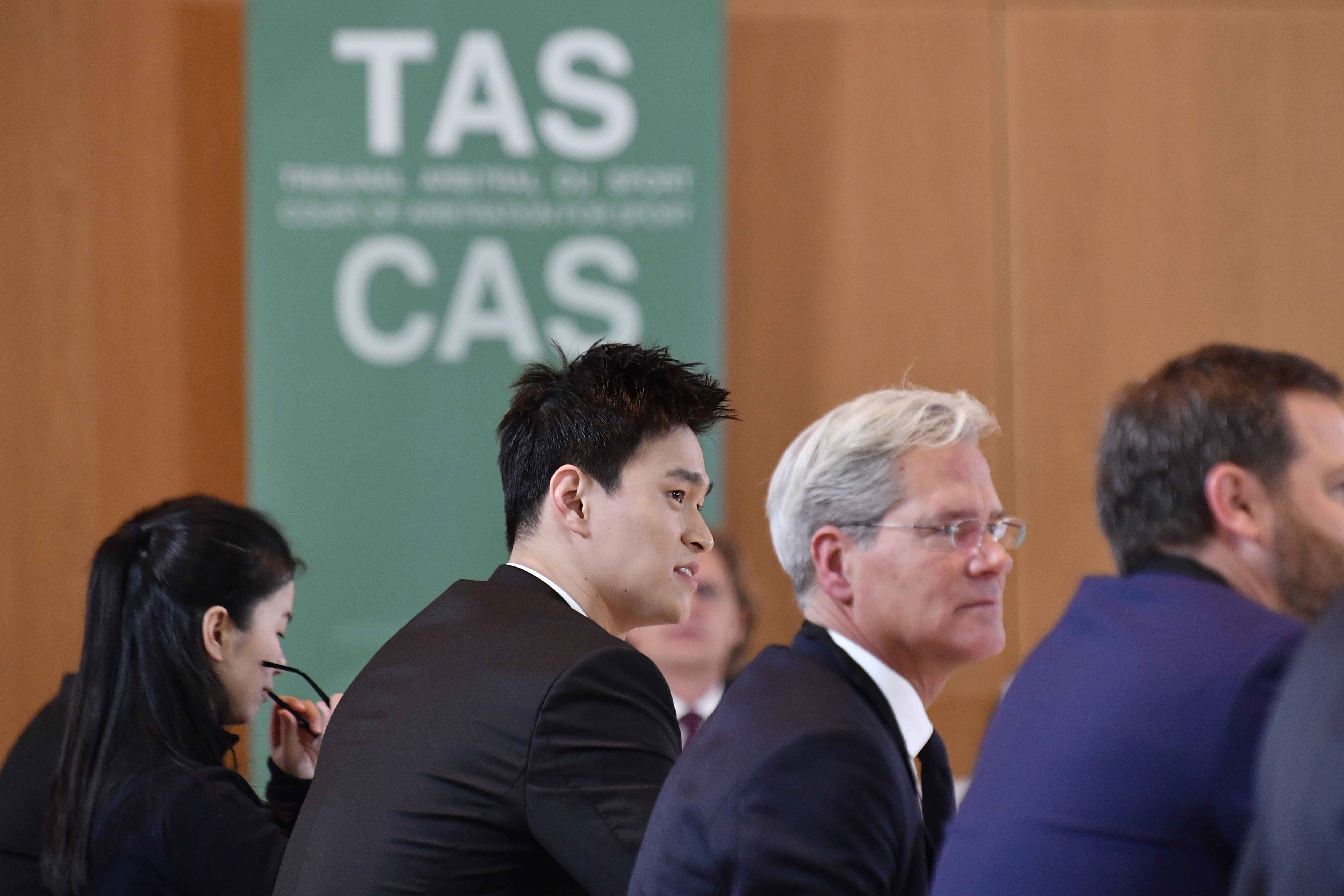 Sun Yang (2nd L) appears at a public hearing in the Court of Arbitration for Sport (CAS) in Montreux, Switzerland, on Nov. 15, 2019, as the World Anti-Doping Agency (WADA) appealed against him and FINA over FINA's previous decision in favor of Sun on his alleged anti-doping rule violations. (Photo by Alain Grosclaude/Xinhua)
