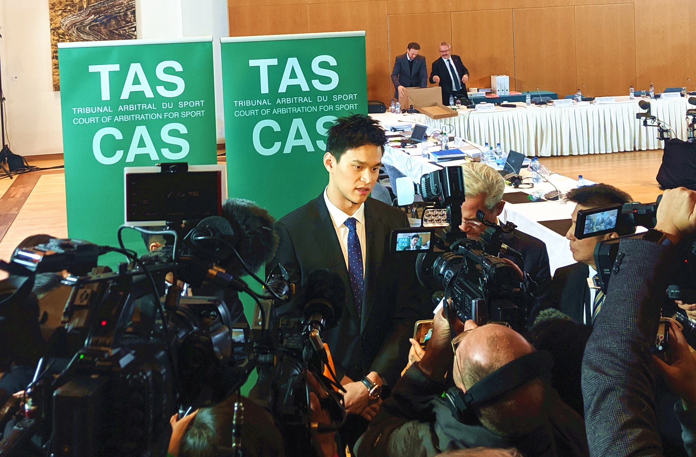 Sun Yang answers questions from the media following the public hearing in the Court of Arbitration for Sport (CAS) in Montreux, Switzerland, on Nov. 15, 2019. (Photo by Xinhua)
