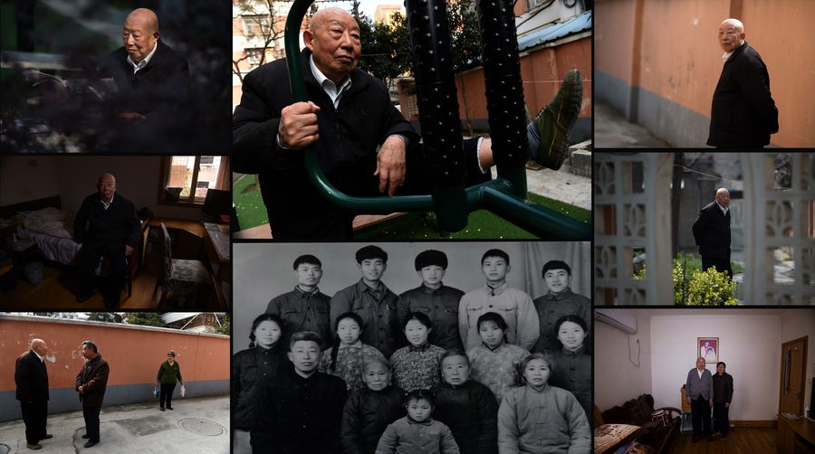 Combo photo shows daily life of Zhu Weiping, a Nanjing Massacre survivor, and his family photo taken in 1976 (C, bottom).(Xinhua/Han Yuqing, Li Xiang and Ji Chunpeng)