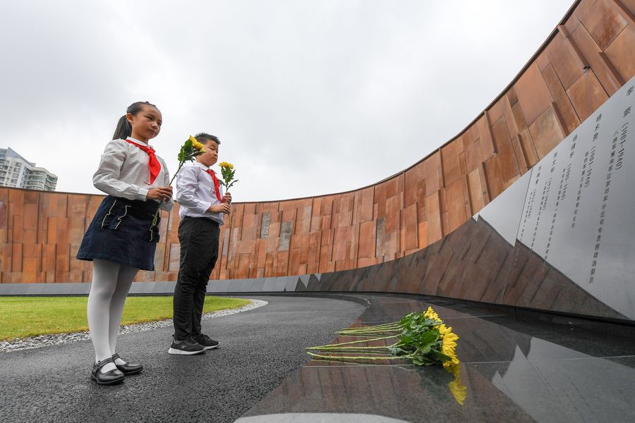 Student representatives lay flowers for Nanjing Massacre victims at the Memorial Hall of the Victims in Nanjing Massacre by Japanese Invaders in Nanjing, east China's Jiangsu Province, Sept. 3, 2019. (Xinhua/Li Bo)