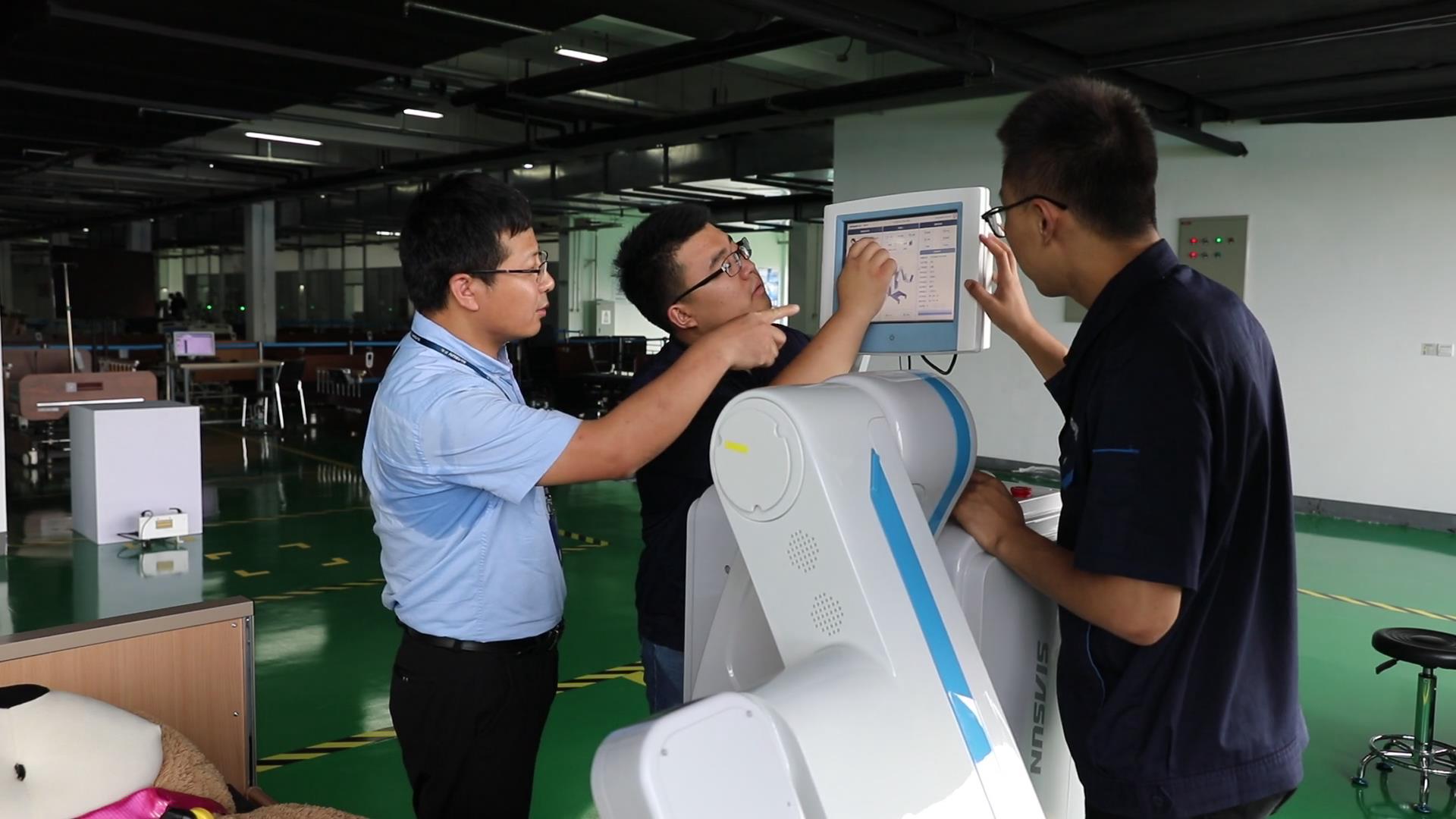 Li Xuewei (1st L), general manager of Siasun's medical and health robot division, is testing a machine in a workshop of Siasun in Shenyang, capital of northeast China's Liaoning Province, Aug. 8, 2019. (Xinhua/Zhao Yong)