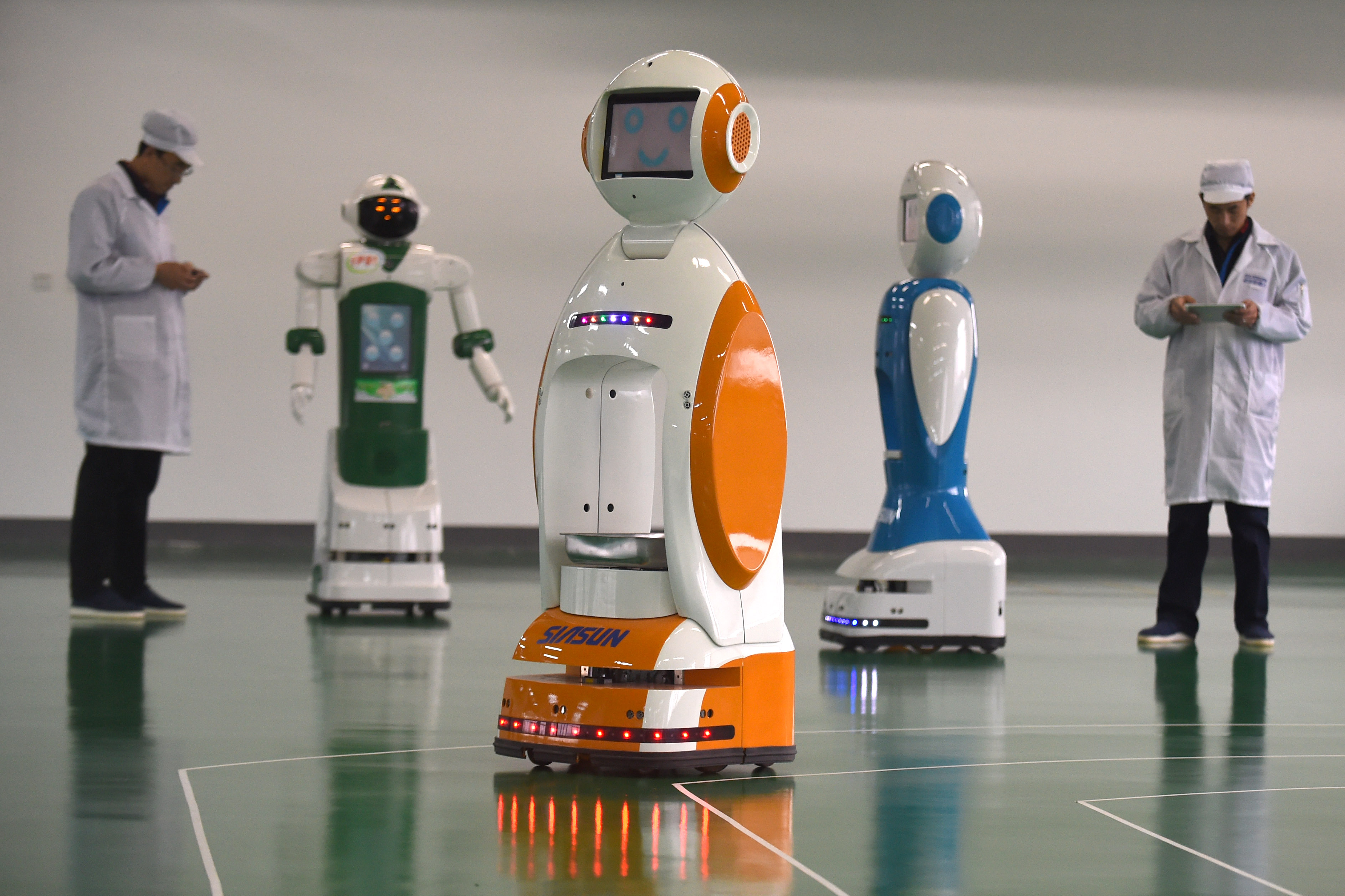 Technicians are testing robots in a workshop of Siasun in Shenyang, capital of northeast China's Liaoning Province, April 12, 2016. (Xinhua/Pan Yulong)