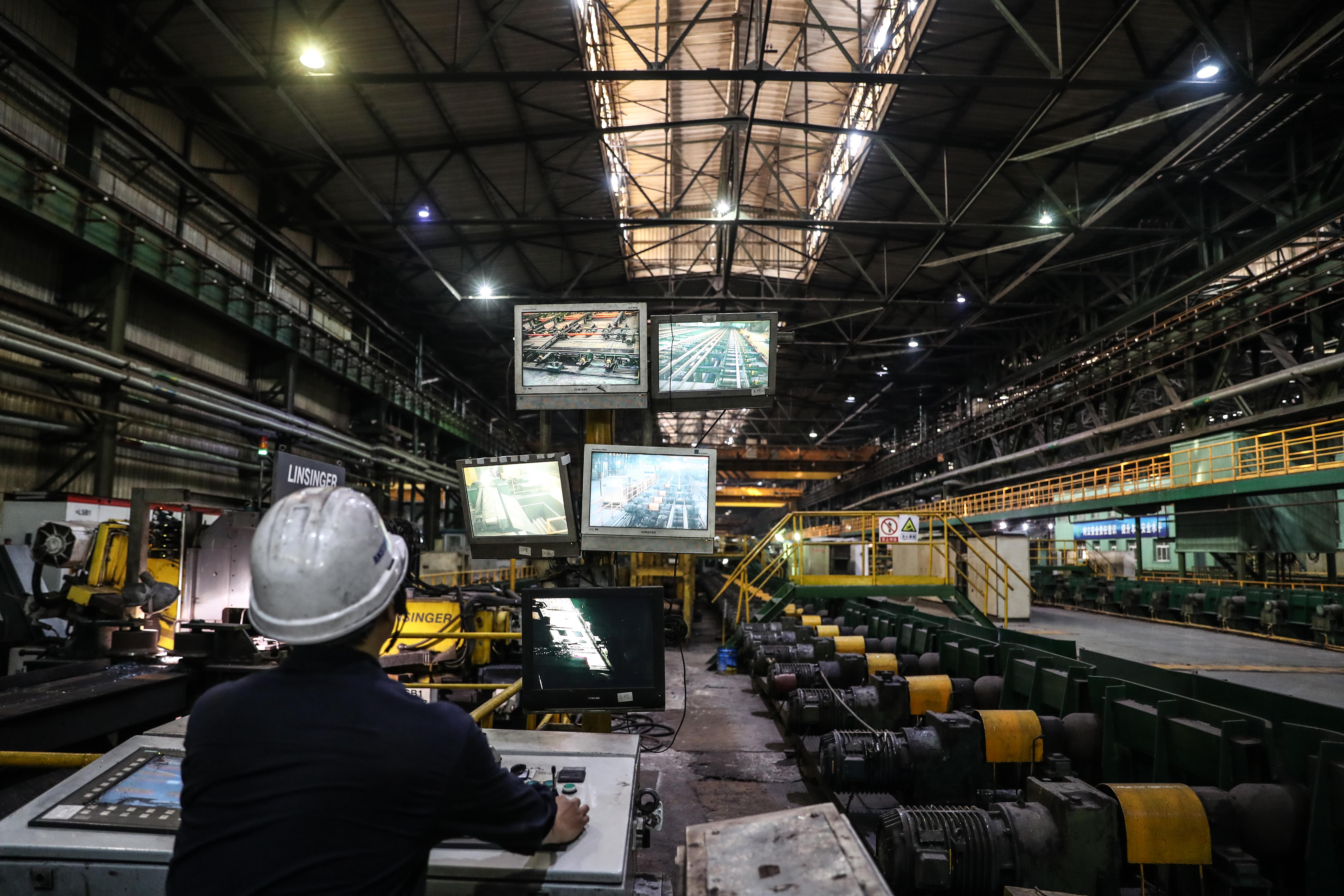A worker is monitoring a production line in Ansteel in the city of Anshan, northeast China's Liaoning Province, July 5, 2019. (Xinhua/Pan Yulong)