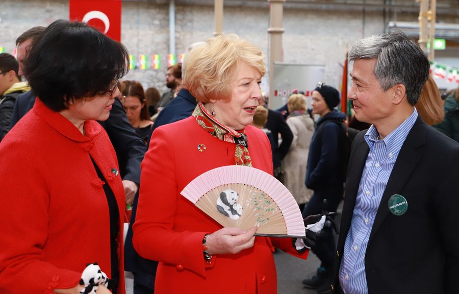 During her visit to the Chinese stall, Sabina Higgins was warmly received by the Chinese ambassador to Ireland He Xiangdong and his wife Xia Lining. Sabina Higgins had a detailed inquiry about some of the artefacts displayed at the Chinese stall called the China Pavilion. She also offered to take a group photo in front of the Chinese stall.