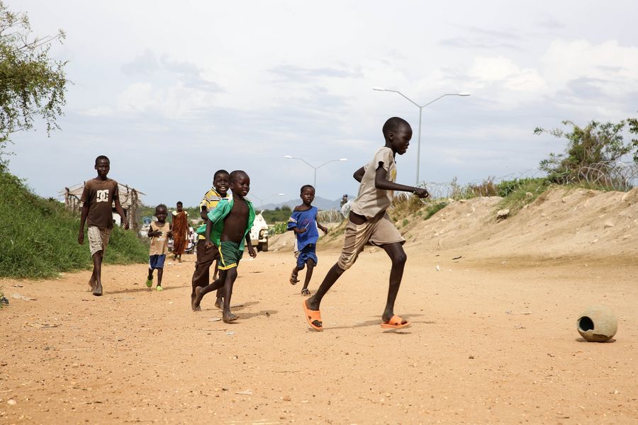 File photo shows refugee children playing games at a refugee camp in Juba, South Sudan, on Nov. 16, 2015. (Xinhua/Pan Siwei)