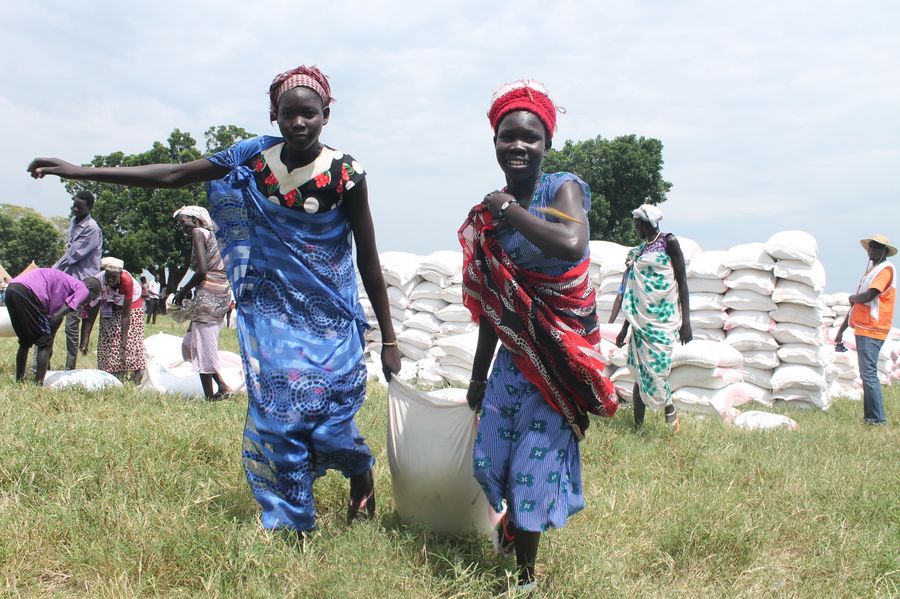 Women carrying food donation delivered to them by World Food Programme (WFP) in Dome, South Sudan, Oct. 4, 2018. (Xinhua/Gale Julius)