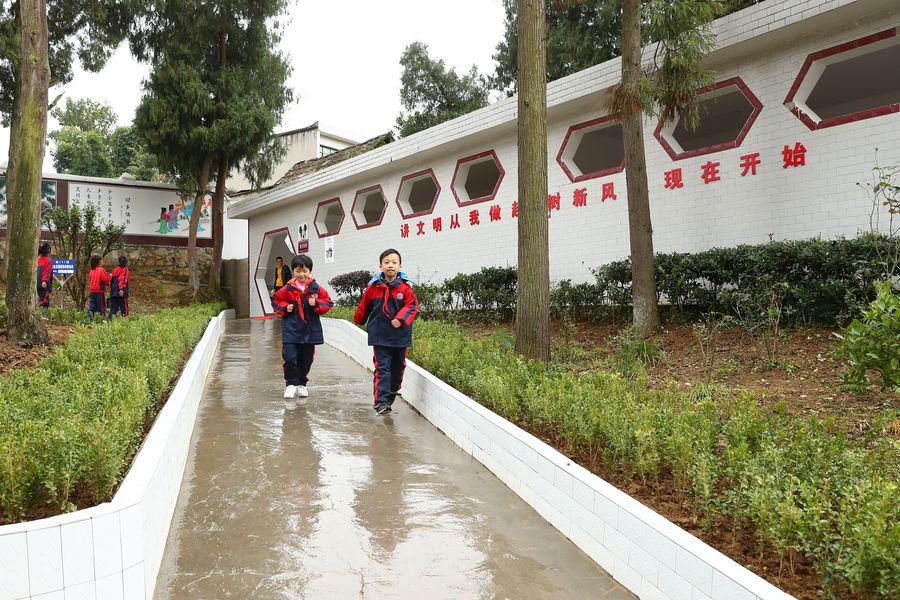 Students walk past the newly-built flush toilet at a primary school in Zhijin County, southwest China's Guizhou Province, Oct. 23, 2018. (Xinhua/Zhang Yuwei)