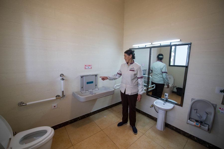 A work staff member introduces the baby-care table inside a public toilet on Hongta West Road in Kunming, capital of southwest China's Yunnan Province, May 16, 2018. (Xinhua/Hu Chao)
