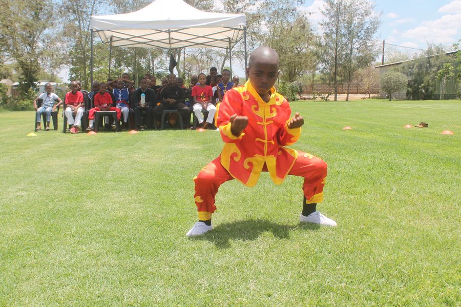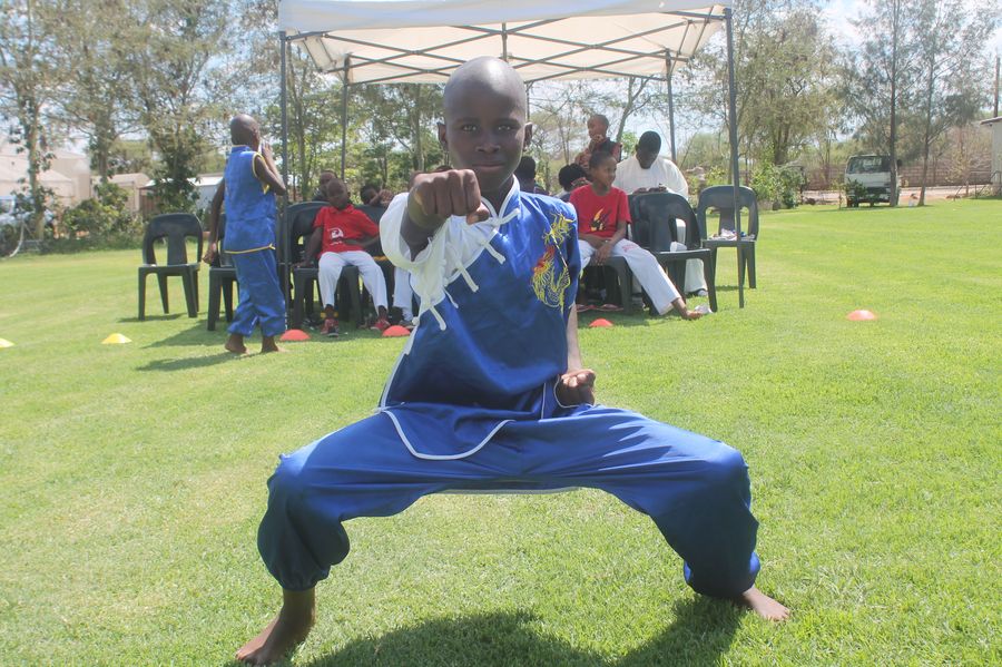 A 13-year-old boy showcases his creativity during the upgrading competitions of kungfu athletes in Francistown, Botswana, Nov. 16, 2019. (Xinhua/Shingirai Madondo)