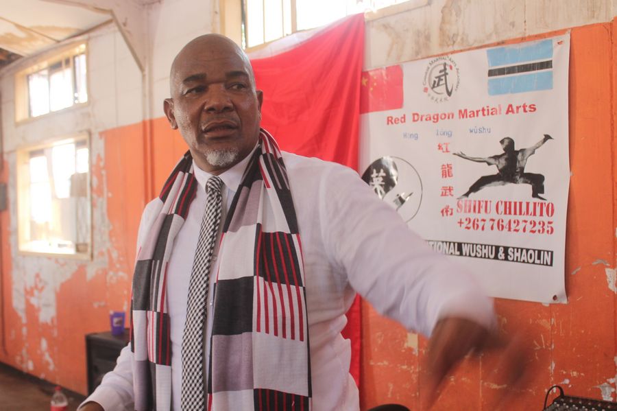 Thuto Thuto, president of Botswana All Budo Style Association speaks during the upgrading competitions of kungfu athletes in Francistown, Botswana, Nov. 16, 2019. (Xinhua/Shingirai Madondo)■