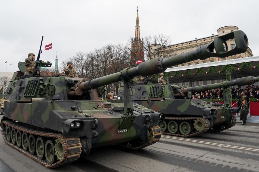Military vehicles are seen during the Independence Day military parade in Riga, Latvia, on Nov. 18, 2019. (Photo by Janis/Xinhua)