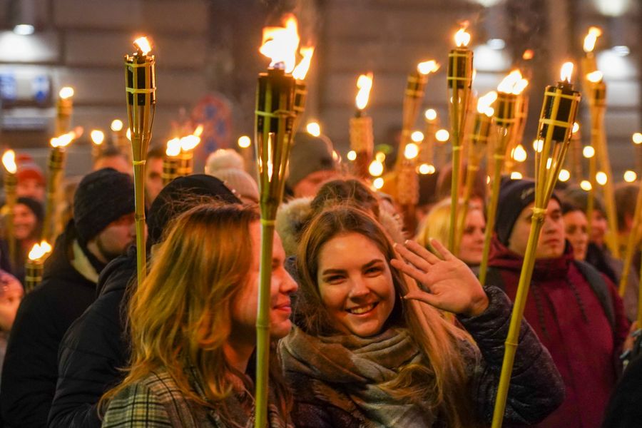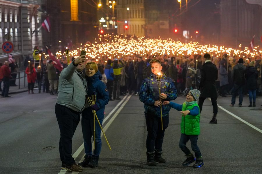 People take part in a torch procession during the Independence day celebration in Riga, Latvia. (Photo by Janis/Xinhua)